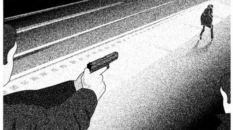 Illustratie op basis van bewakingsbeeld. Een agent schiet op Rishi Chandrikasing op het perron van Hollands Spoor en treft hem in de hals. Foto ANP / Jeroen Luizink